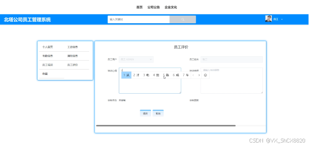 (7)员工后台管理:员工用户登录系统后台可以对工资信息管理、考勤信息管理、请假信息管理、员工培训管理、员工评价管理这几个模块进行管理。