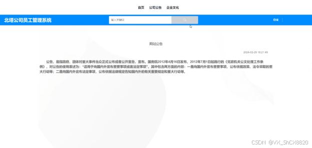 (3)公司公告:当用户点击“公司公告”这一菜单按钮,会显示管理员在后台发布的所有的公司公告,可以查看详情。