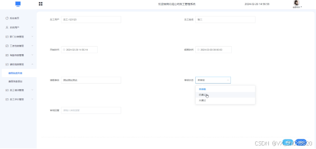 (6)请假信息管理:管理员点击“请假信息管理”可以对员工用户的请假信息进行审核回复。