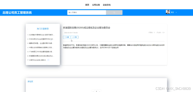 (4)企业文化:当用户点击“企业文化”这一菜单按钮,会显示管理员在后台发布的所有的企业文化,可以查看详情,进行收藏、点赞、评论等。