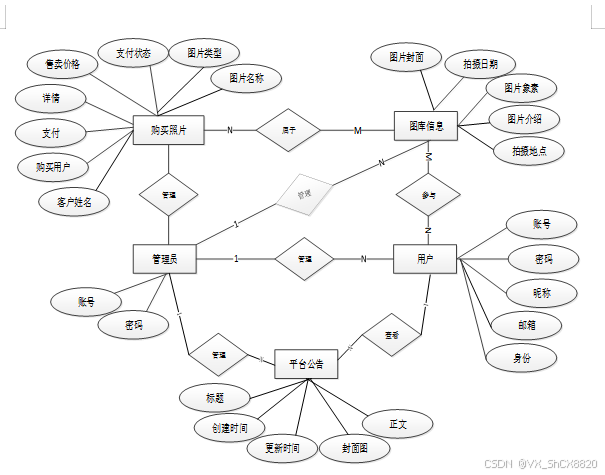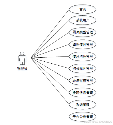 基于微信小程序的商业图库交易平台的设计基于现有的手机,管理员可以实现首页、系统用户(管理员、客户用户、摄影师用户)、图片类型管理(图片类型列表、图片类型添加)、图库信息管理(图库信息列表、图库信息添加)、信息沟通管理(信息沟通列表)、购买照片管理(购买照片列表)、经济收益管理(经济收益列表、经济收益添加)、提现信息管理(提现信息列表)、系统管理(轮播图管理)、平台公告管理(平台公告)等功能。管理员用例图如下: