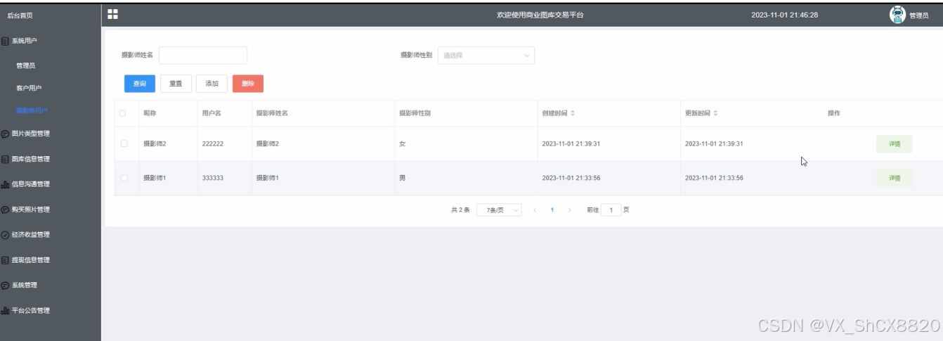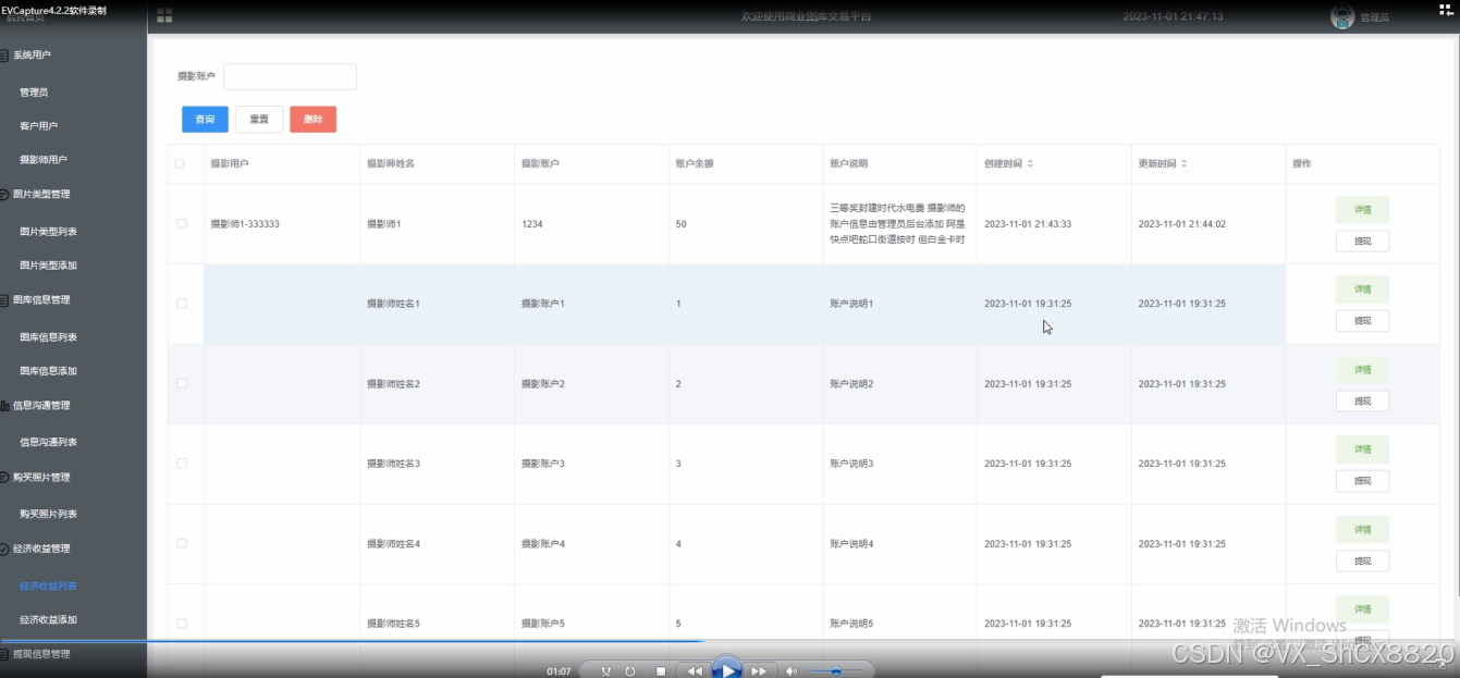 经济收益管理,在经济收益管理页面可以查看摄影用户、摄影师姓名、摄影账户、账户余额、账户说明、创建时间、更新时间等信息,并可根据需要进行修改或删除和查询等操作,如下图所示。