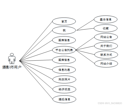摄影师用户可以实现首页、我(基本信息、收藏)、平台公告列表(网站公告、关于我们、联系方式、网站介绍)、图库信息、信息沟通、购买照片、经济效益、提现信息等功能。摄影师用户用例图如下: