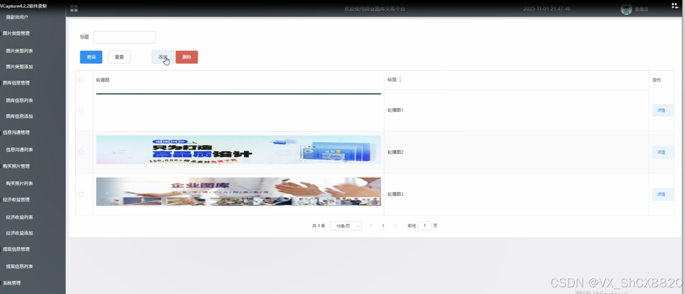 系统管理,在系统管理页面管理员可以对系统前台展示的轮播图进行增删改查,方便用户进行查看。如下图所示。