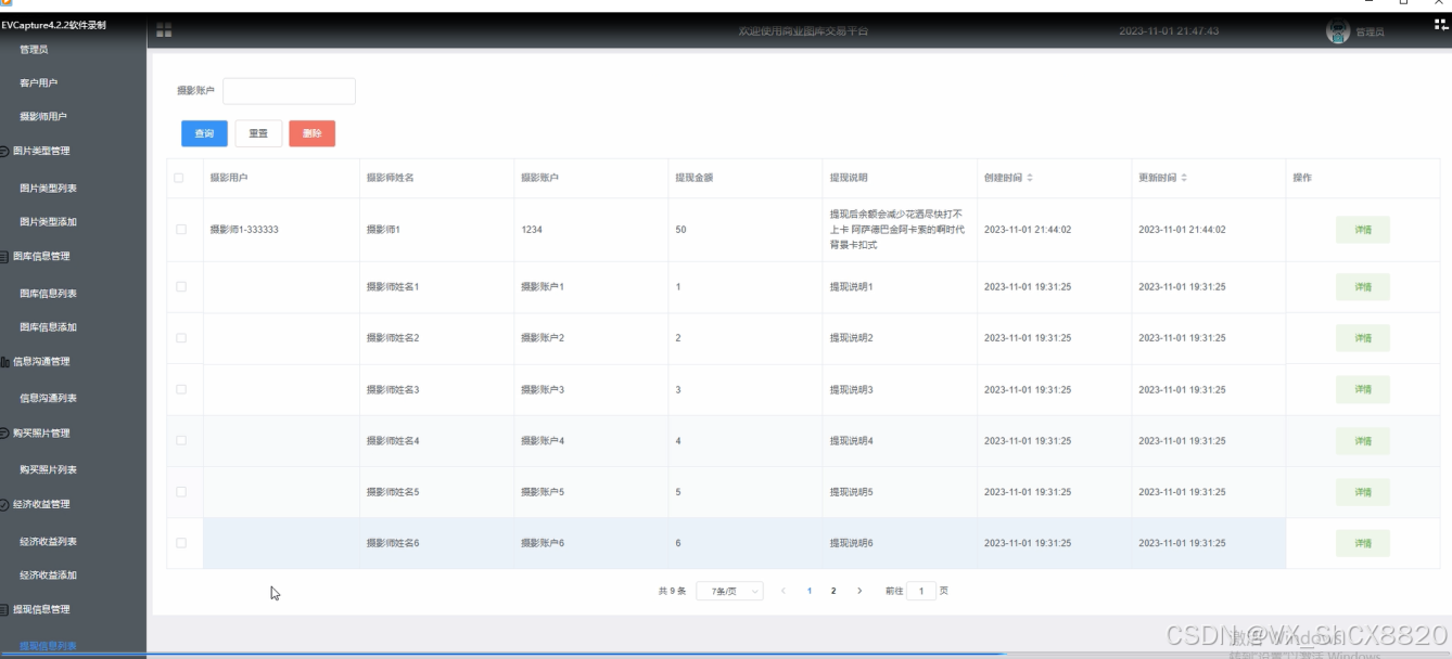 提现信息管理,在提现信息管理页面可以查看摄影用户、摄影师姓名、摄影账户、提现金额、提现说明、创建时间、更新时间等信息,并可根据需要进行详情、查询、修改或删除等操作,如下图所示。