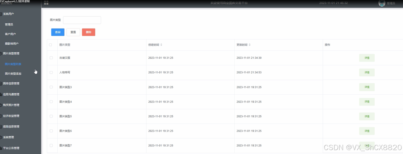 图片类型管理,在图片类型管理页面可以对图片类型列表、图片类型添加进行新增、删除等操作,如下图所示。