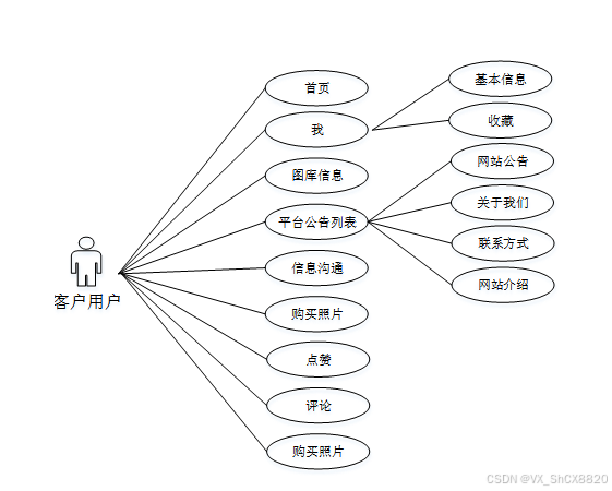客户用户可以实现首页、我(基本信息、收藏)、图库信息、平台公告列表(网站公告、关于我们、联系方式、网站介绍)、信息沟通、购买照片等功能。客户用户用例图如下: