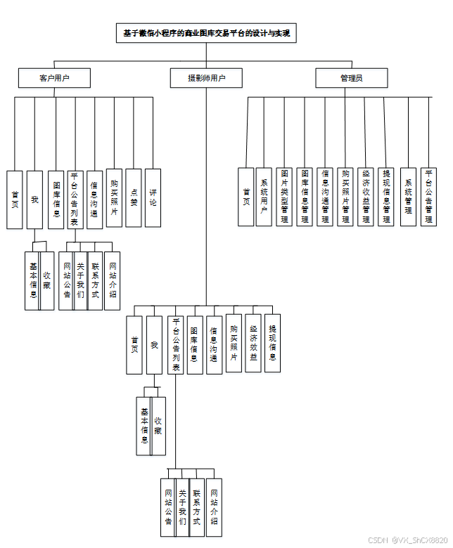 (3)确定好系统使用的技术,进行在线确认系统所划分的用户角色,并且根据用户角色划分确定所要设计的功能模块,对于微信小程序的商业图库交易平台的设计主要划分别为管理员、客户用户和摄影师用户角色,并所使用的功能模块也相应不同,但是系统的数据库实现的内容是交互的,用户可以随时根据自己的需求查看图片信息,对于系统工作人员可以根据自己的分管内容进行在线信息的处理及操作,管理员获取到所有用户的详细数据信息,并根据需求进行第一时间处理解决。