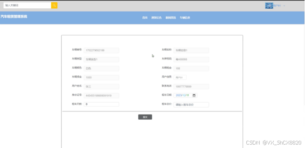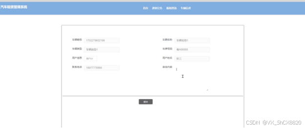 (4)租车:当用户在车辆信息详情界面想要进行租车,点击下方的“租车”按钮,就会跳转到租车信息填写界面,根据界面提示输入租车信息,点击“提交”按钮,租车就完成了;