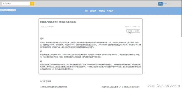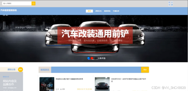 (2)查看汽车租赁管理系统的首页信息:汽车租赁管理系统的首页信息包含了首页、通知公告、新闻资讯、车辆信息等。