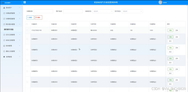 (4)预约租车:管理员点击“预约租车列表”会显示出所有的预约租车信息,支持输入车辆名称或者车辆类型对预约租车信息进行查询,如果想要添加新的预约租车信息,点击“预约租车添加”按钮,输入相关信息,点击“提交”按钮就可以添加了,同时可以选择某一条预约租车信息,点击“删除”进行删除,也可以点击后面的“还车”、“支付”按钮对预约租车的还车信息进行更新维护、对预约租车的支付信息进行设置;