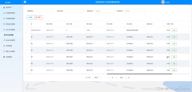(5)还车记录:管理员点击“还车记录列表”会显示出所有的还车记录信息,支持通过车辆名称或者用户姓名或者押金状态对还车记录信息进行查询,也可以选择某一条还车记录信息,点击“删除”进行删除。