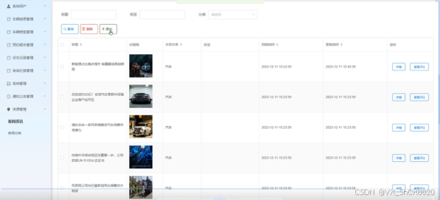 管理员点击“资源管理”菜单能够对其下子菜单新闻资讯和新闻资讯的分类进行增删改查。界面如下图4-13所示。