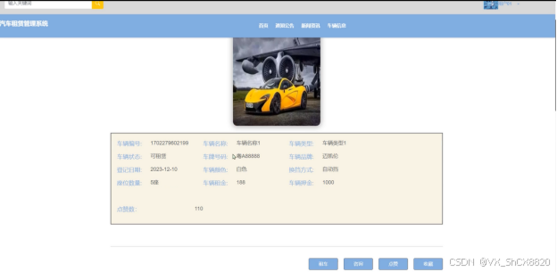 (3)车辆信息:当用户点击“车辆信息”这一菜单按钮,会显示管理员在后台发布的所有的车辆信息,支持通过关键词对车辆信息进行搜索,选择需要的车辆信息点击可以进入到车辆信息详细的介绍界面,在详细界面可以查看到车辆信息的车辆名称、车辆类型、车辆状态、车辆租金等信息,同时可以进行租车、咨询、点赞、收藏、评论操作;