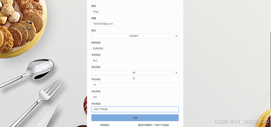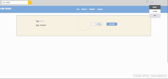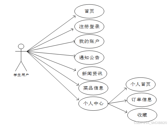 学生用户的功能:首页、注册登录、我的账户、通知公告、新闻资讯、菜品信息、个人中心(个人首页、订单信息、收藏)等功能。