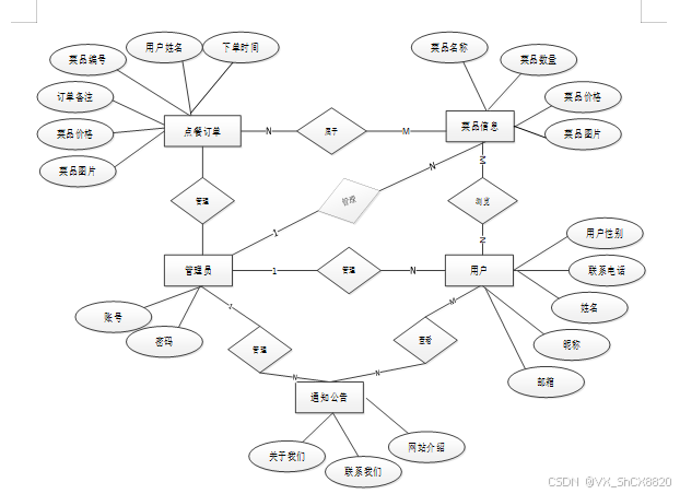 对于一个要开发的系统来说,E-R图可以让别人能更快更轻松的了解此系统的事务及它们之间的关系。根据系统分析阶段所得出的结论确定了在校园订餐系统中存在着多个实体分别是首页、通知公告、新闻资讯、菜品信息等。