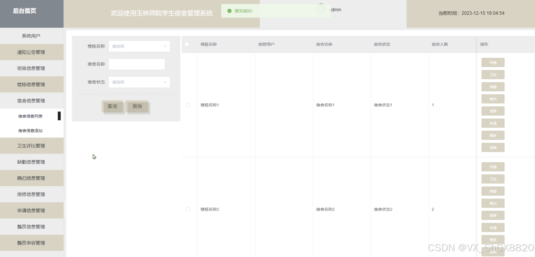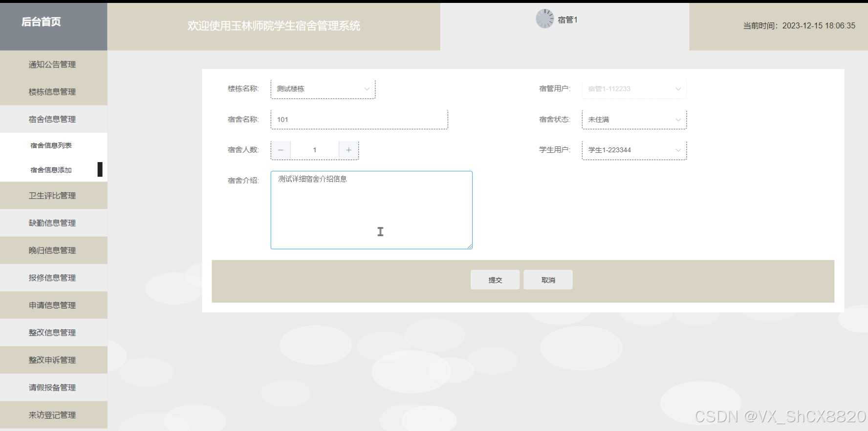 | 预期结果 | 提交以后,页面首页会显示新的宿舍信息信息 |