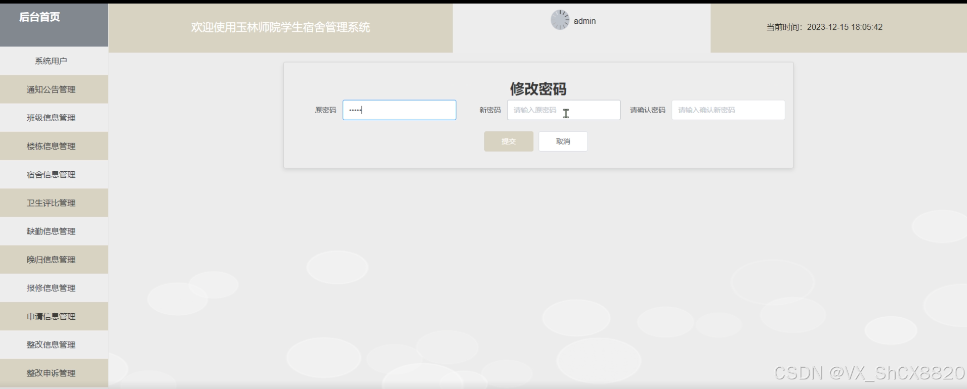 (2)玉林师院学生宿舍管理系统中的web后台管理中的前端使用的是bootstrap框架,它配合ajax和jquery可以美化页面设计。