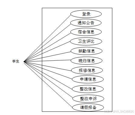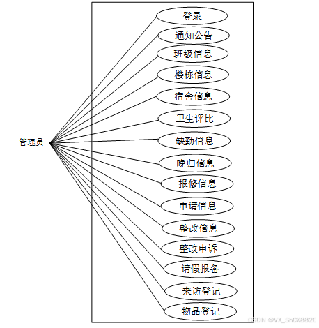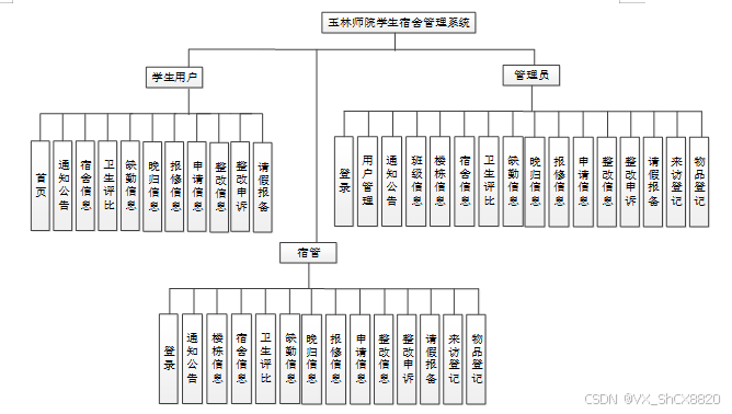 通过了解对玉林师院学生宿舍管理系统的真实需求后,将玉林师院学生宿舍管理系统所需要的角色划分整理成了下图2-1,图2-2和图2-3。