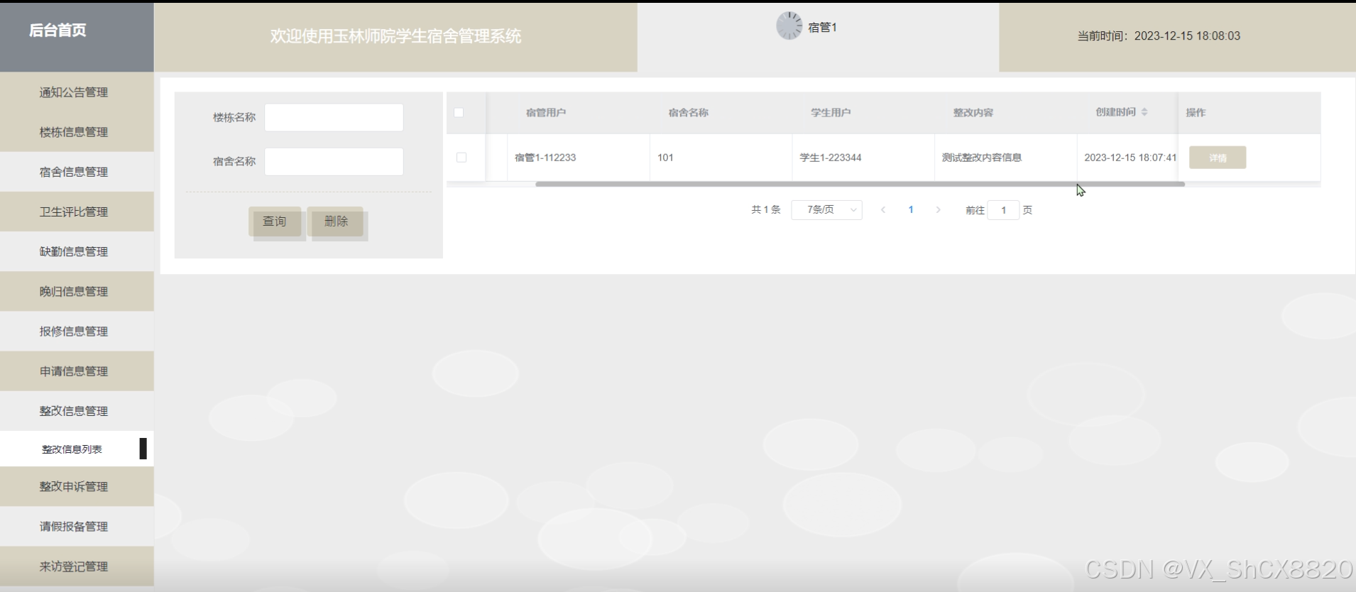 当点击“整改信息”这一菜单的时候,可以查看宿管用户、宿舍名称、学生用户、整改内容,管理员能够对整改信息信息进行增删改查操作,整改信息界面如下图4.6所示。