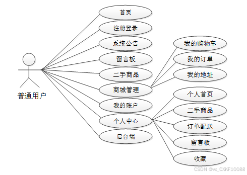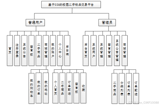 按照基于SSM的校园二手物品交易平台的角色,主要划分为普通用户和管理员两大功能模块,具体内容如下。