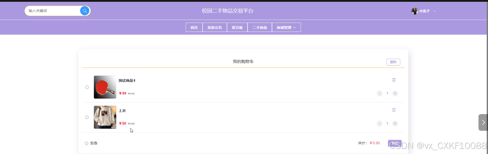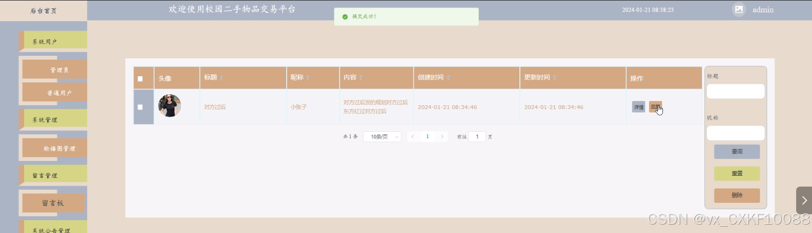 - 商城管理:管理员可以查看和管理商城管理中的二手商品、分类列表、订单列表、订单配送信息。