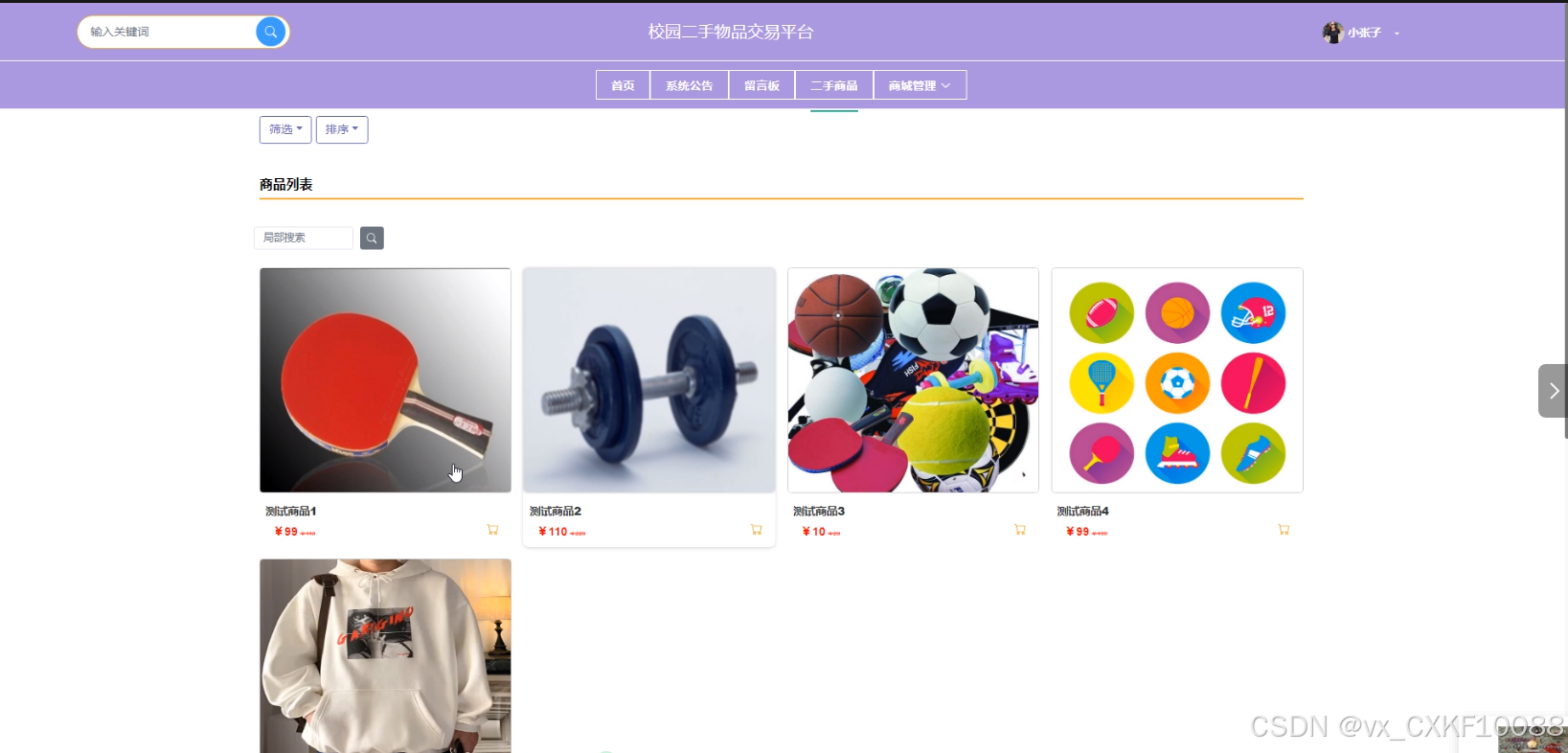 - 二手商品:用户可以查看商品列表信息,点击某一商品可以查看商品详情并进行点赞、发表评论、加入购物车和完成在线购买操作,购买后可以对商品进行评论。