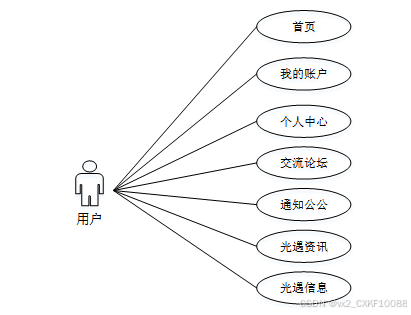 (2)用户:首页、我的账户、个人中心、交流论坛、通知公告、光遇资讯、光遇信息等功能,用户用例图如图3-2所示。