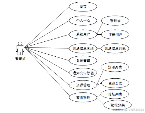 (1)管理员模块:系统中的核心用户是管理员:后台首页、系统用户(管理员、注册用户)光遇信息管理(光遇信息列表)系统管理(轮播图管理)通知公告管理(通知公告)资源管理(资讯列表、资讯分类)交流管理(论坛列表、论坛分类)等功能。管理员用例图如图3-1所示。