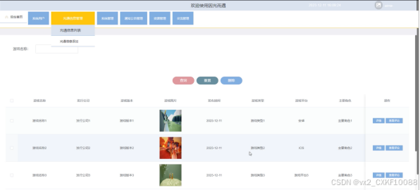 光遇游戏网站的主要使用者分为管理员和用户,实现功能包括管理员:后台首页、系统用户(管理员、注册用户)光遇信息管理(光遇信息列表)系统管理(轮播图管理)通知公告管理(通知公告)资源管理(资讯列表、资讯分类)交流管理(论坛列表、论坛分类)用户:首页、我的账户、个人中心、交流论坛、通知公告、光遇资讯、光遇信息等功能。由于本网站的功能模块设计比较全面,所以使得游戏网站信息管理的过程得以实现。