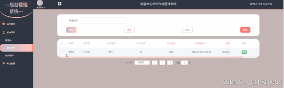 Through the design and development of this study, the student homework management system can meet the needs of teachers assigning homework, students submitting homework, and homework grading and feedback. At the same time, the system also provides functions such as subject list, question bank, error record, and test paper list, providing students with practice resources and test questions. By using this system, teachers can better guide students, monitor learning progress, and promptly identify and correct student errors. Students can easily view homework tasks, submit assignments, and receive teacher ratings and feedback.