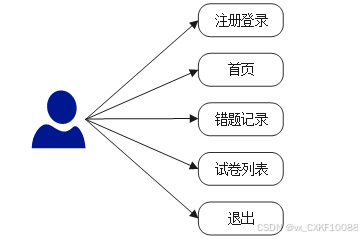 学生作业管理系统的完整UML用例图分别是图3-1和图3-2。在参与者上包括教师用户、学生用户以及管理员。学生用户角色用例包括学生是注册成为我们正是学生的用户、学生登录、考试管理、试卷列表、错题记录,学生用户角色用例如图3-1所示。