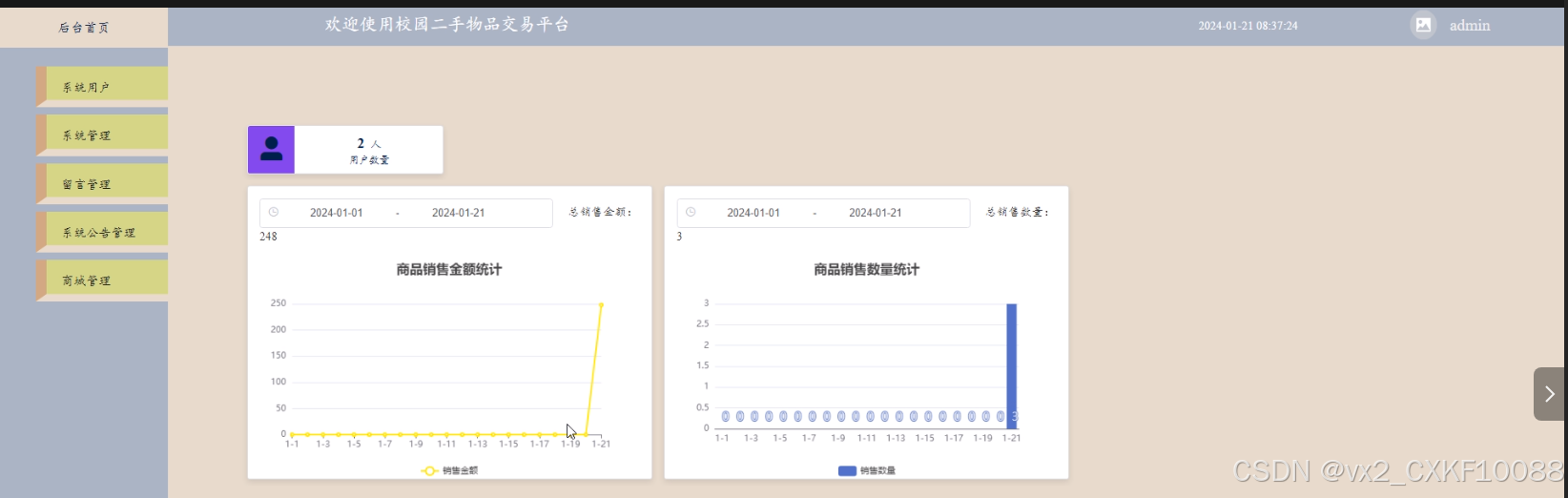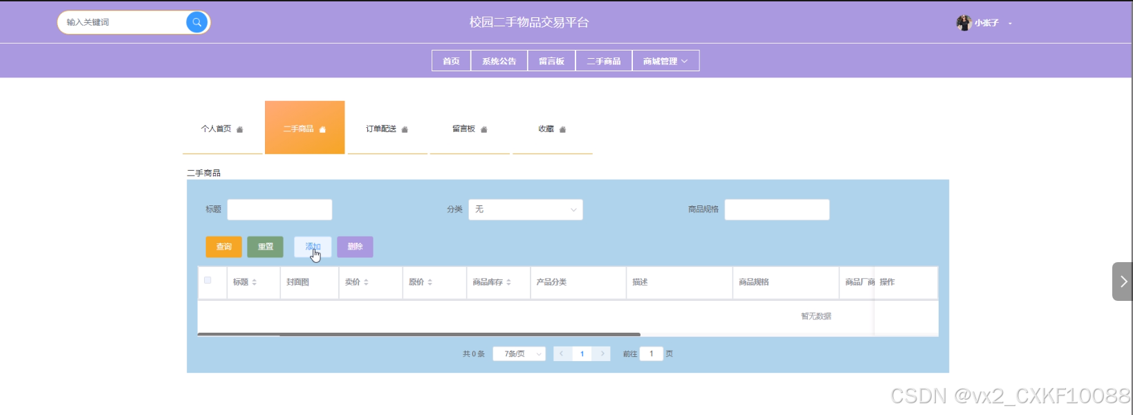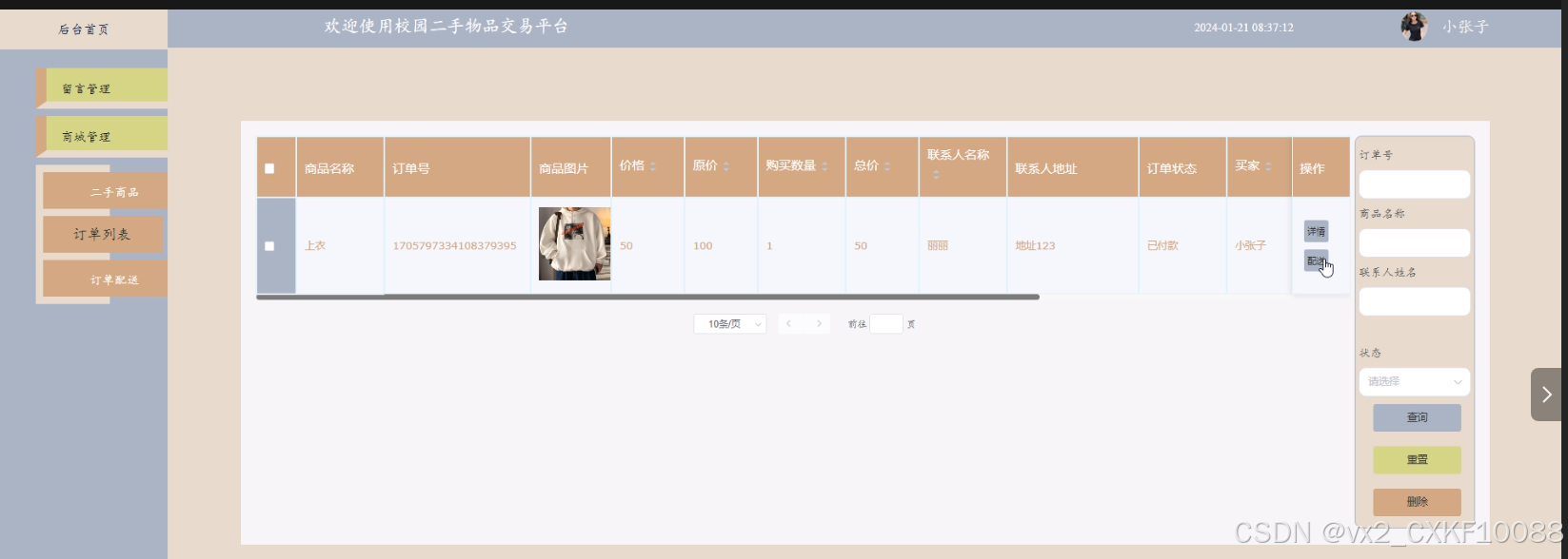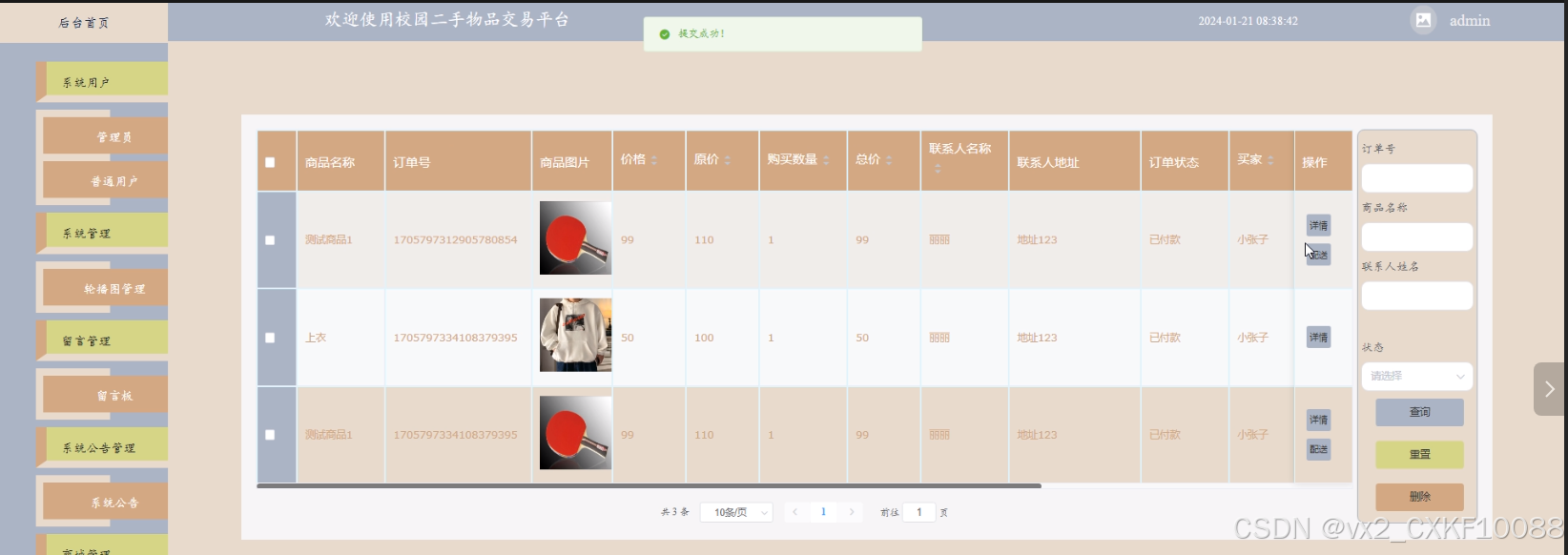 - 商城管理:管理员可以查看和管理商城管理中的二手商品、分类列表、订单列表、订单配送信息。