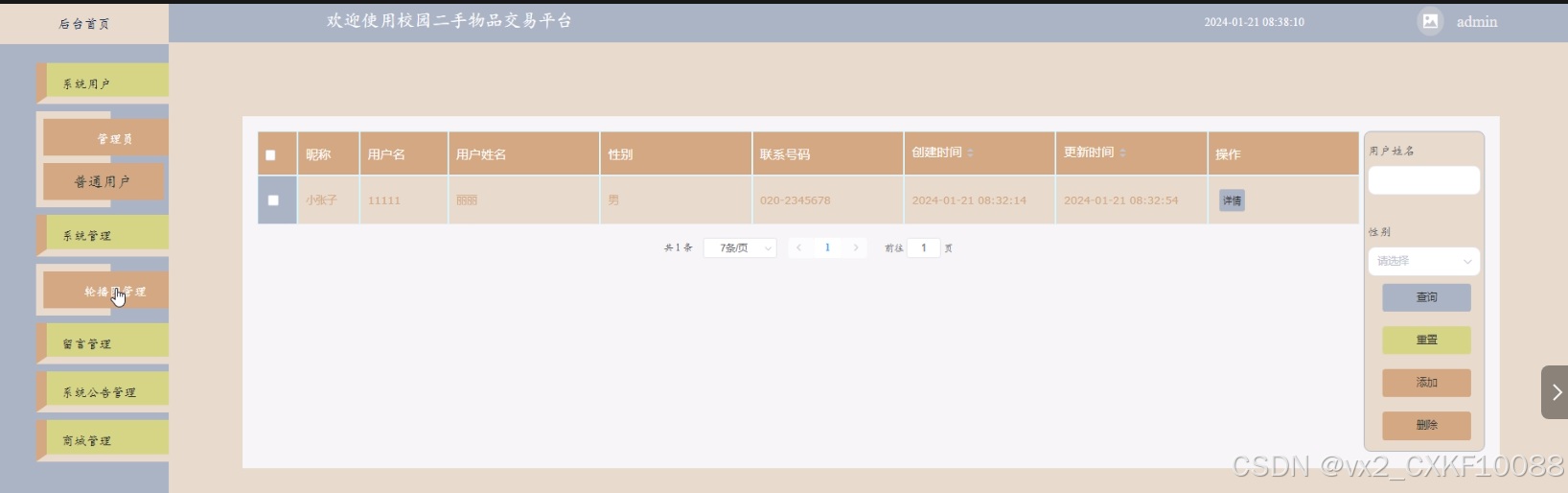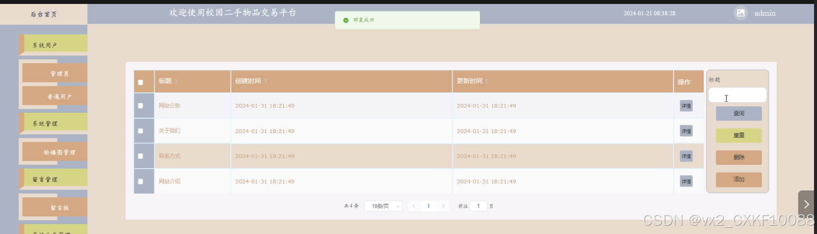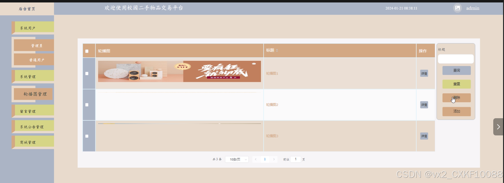 - 系统管理:管理员可以对系统轮播图信息进行查询、重置和删除操作。