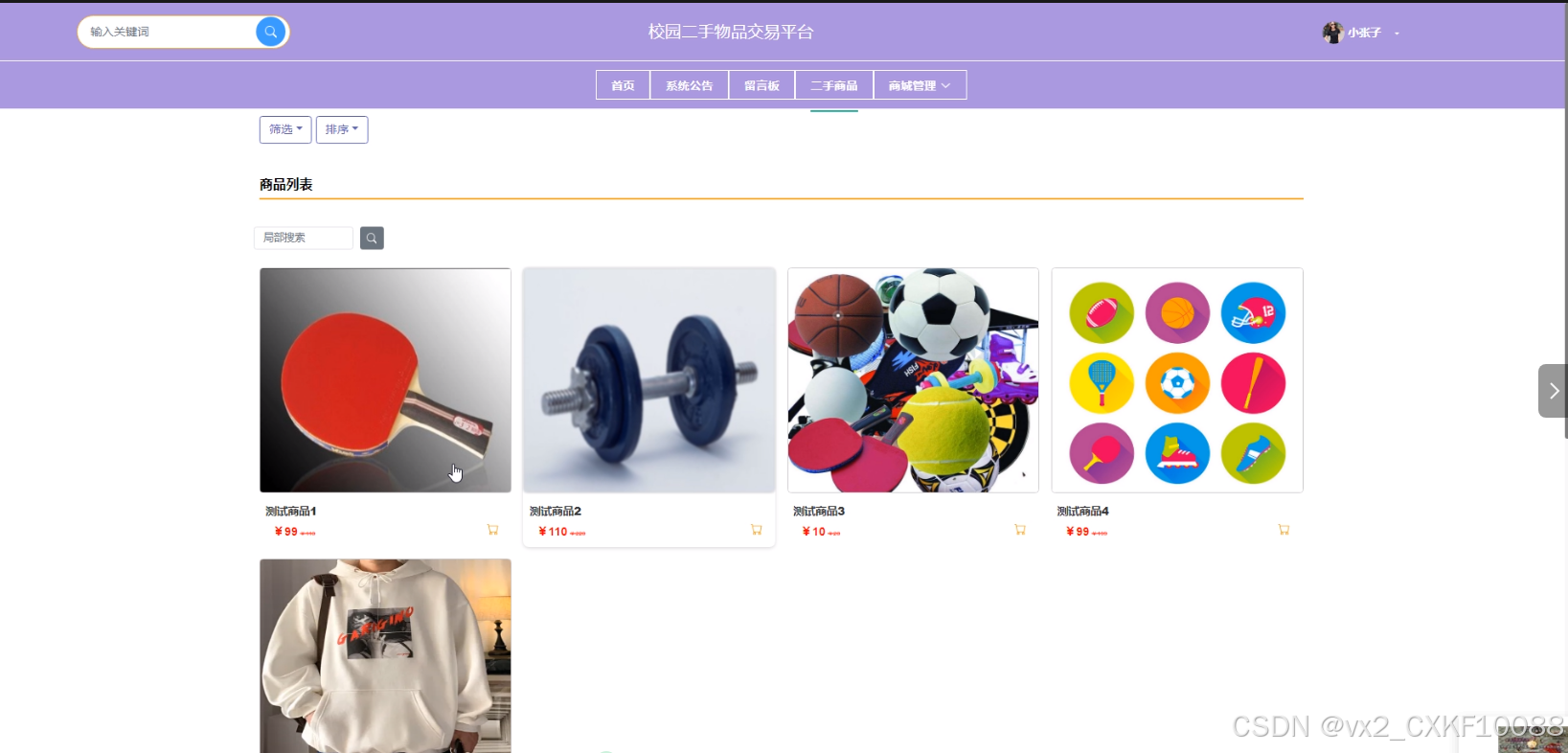 - 二手商品:用户可以查看商品列表信息,点击某一商品可以查看商品详情并进行点赞、发表评论、加入购物车和完成在线购买操作,购买后可以对商品进行评论。
