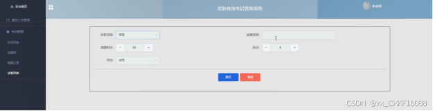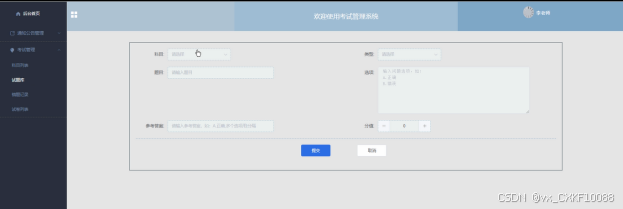 (3)考试管理:用户点击可查看科目列表、试题库、错题记录和试卷列表;点击“试题库”“添加”,选择科目和类型,输入题目、选项、参考答案和分值,点击“提交”按钮进行添加。点击“试卷列表”“添加”,选择科目名称,输入试卷名称、答题时长、总分和选择状态,点击“提交”按钮进行添加;同时可对用户答题进行评分操作。