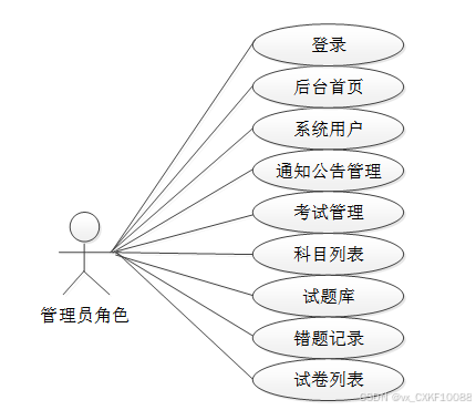 后台管理上的管理员是维护整个考试管理系统的设计与实现中所有数据信息的。管理员角色用例如图2-4所示。