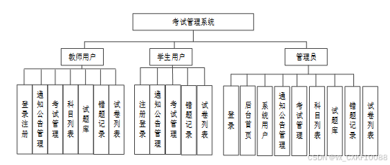 按照考试管理系统的设计与实现的角色,划分为了学生用户、教师用户和管理员三大模块: