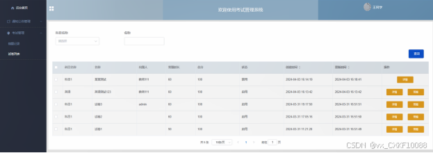考试管理:管理员点击可查看科目列表、试题库、错题记录和试卷列表;界面如下图所示。