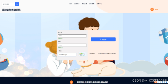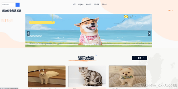 (2)查看流浪动物救助系统的首页信息:流浪动物救助系统的首页信息包含了首页、交流中心、系统公告、资讯信息、领养中心、我的账户、个人中心等。