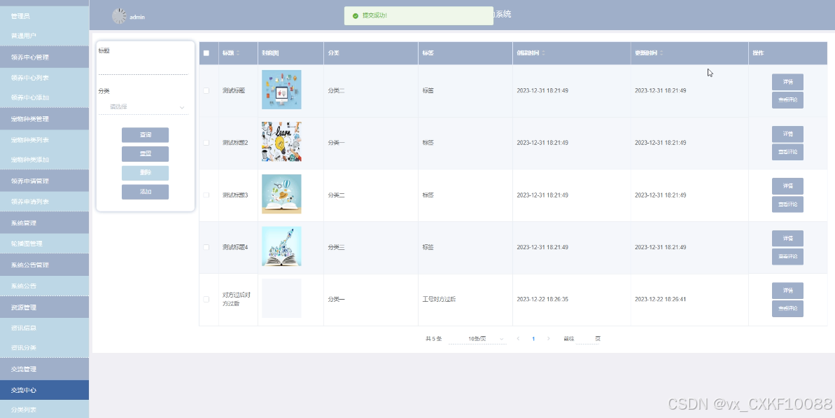 管理员点击“交流管理”菜单能够对其下子菜单交流中心和所属分类列表进行增删改查。交流管理界面如下图所示。