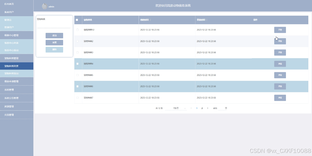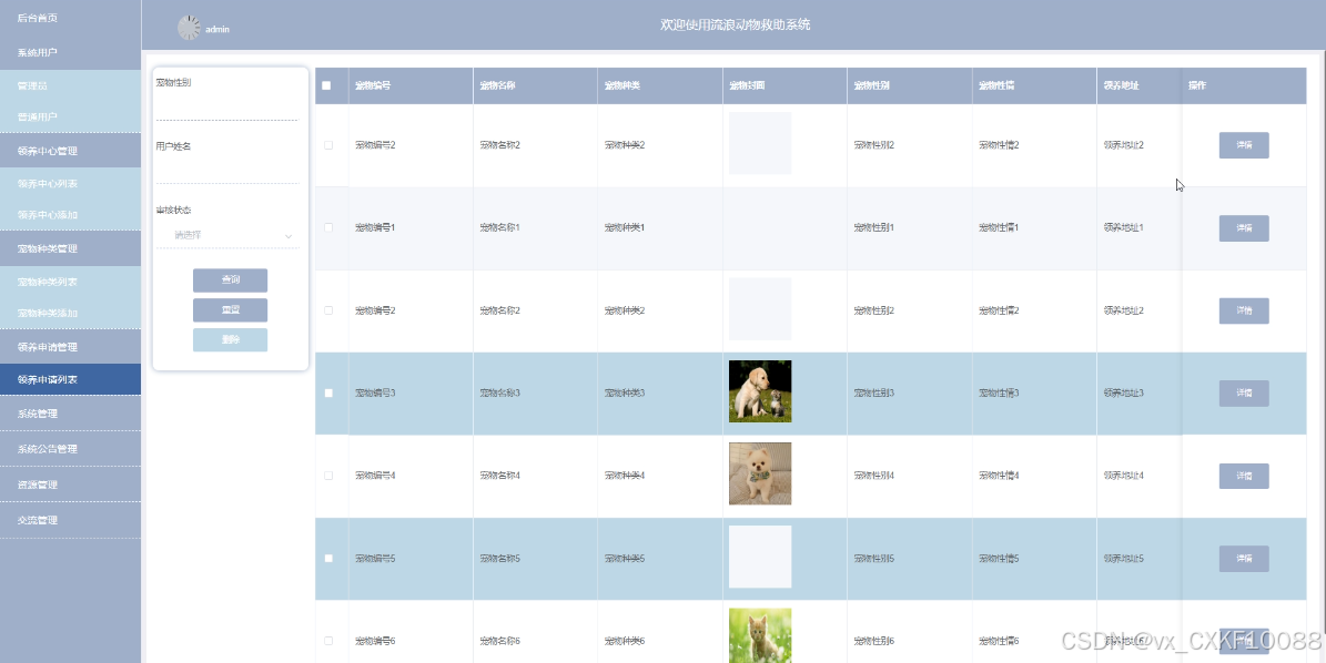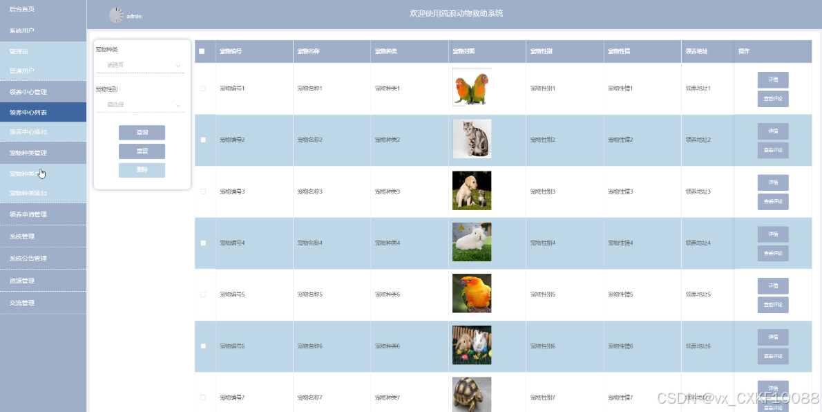 后台管理员管理模块:系统用户、领养中心管理、宠物种类管理、领养申请管理、系统管理、系统公告管理、资源管理、交流管理
