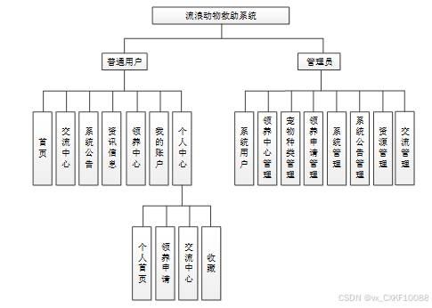 流浪动物救助系统我划分为了普通用户模块和管理员模块这两大部分。