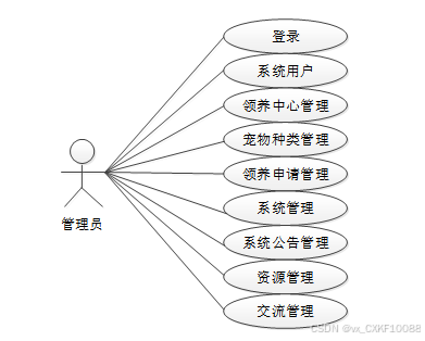 web后台管理上的管理员是维护整个流浪动物救助系统平台中所有数据信息的,管理员可以进行登录、系统用户、领养中心、用户申请领养管理、宠物种类管理、评价分享管理、系统管理、系统公告管理、资源管理。管理员角色用例如图2-3所示。