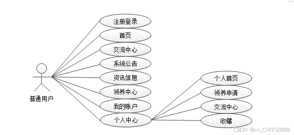流浪动物救助系统的完整UML用例图分别是图2-1和图2-2。在参与者上包括普通用户以及管理员。普通用户角色用例包括用户注册登录、首页、交流中心、系统公告、资讯信息、领养中心、我的账户、个人中心(个人首页、领养申请、交流中心、收藏)等,普通用户角色用例如图2-1所示。