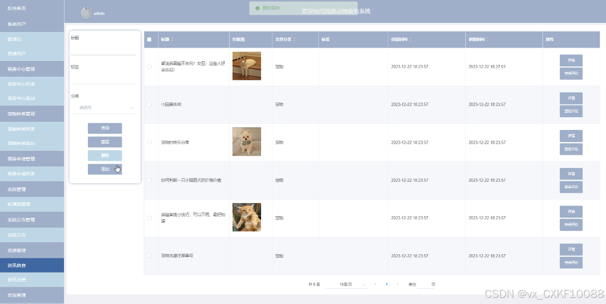 (8)资源管理:管理员可以对流浪动物救助系统前台展示的资讯信息以及资讯信息所属的分类进行管控。