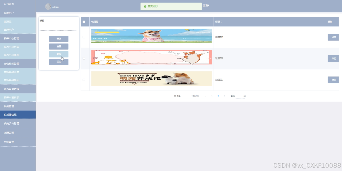 流浪动物救助系统平台中的管理人员在“系统管理”这一菜单下是可以对流浪动物救助系统内的轮播图进行添加修改的,其管理界面如下图所示。
