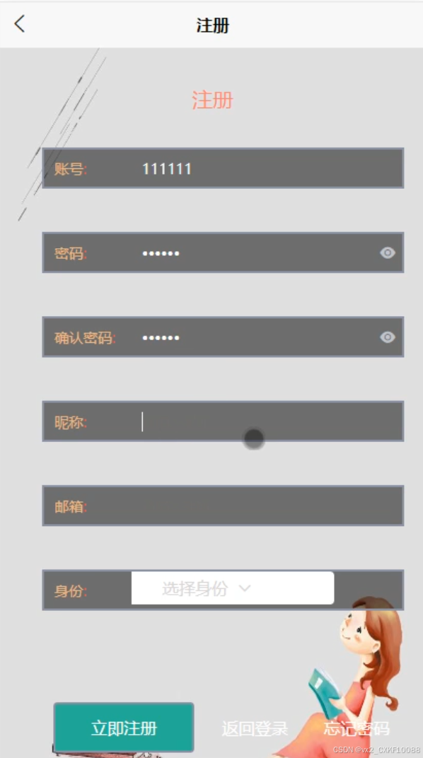 不是教学设备管理系统中正式会员的是可以在线进行注册的,当填写上自己的账号+设置密码+确认密码+昵称+邮箱+手机号+身份后+用户名再点击“注册”按钮后将会先验证输入的有没有空数据,再次验证密码和确认密码是否是一样的,最后验证输入的账户名和数据库表中已经注册的账户名是否重复,只有都验证没问题后即可会员注册成功,如图5-1所示。