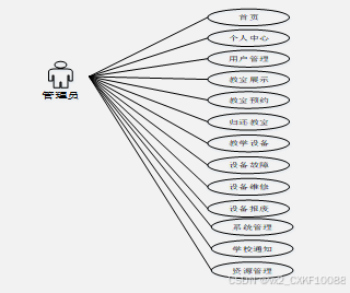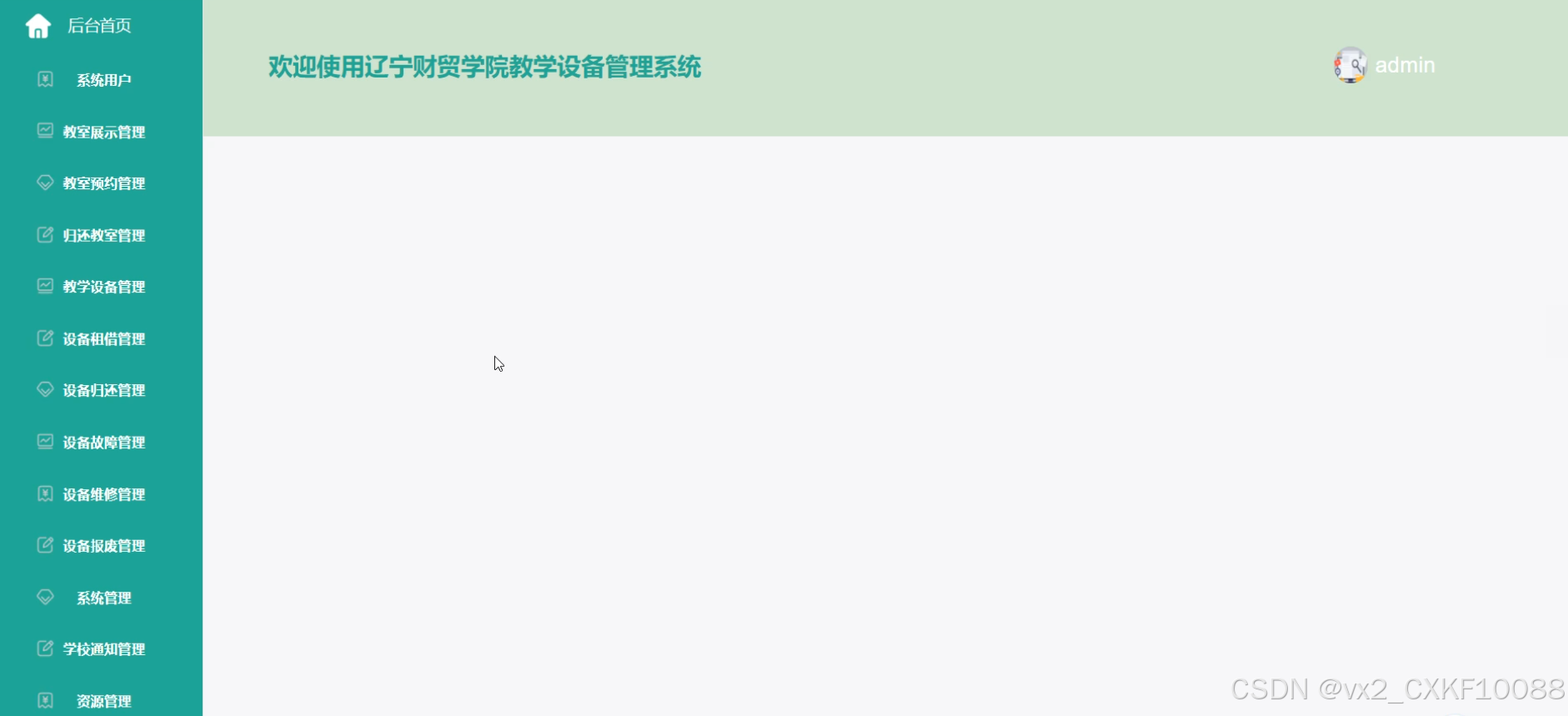 通过管理员功能页面,用户可以查看首页、系统用户(管理员、普通用户)教室展示、教室预约、归还教室、教学设备、设备租借、设备归还、设备故障、设备维修、设备报废、系统管理(轮播图)学校通知、资源管理(学校资讯、资讯分类)等,并且可以根据需要进行相应的操作,如图5-8所示。