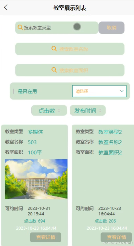 在教室展示页面,用户可以轻松获取有关教室展示的详细信息,还可以通过关键字快速搜索,同时还可以进行教室预约、教室归还提交等功能,如图5-4所示。